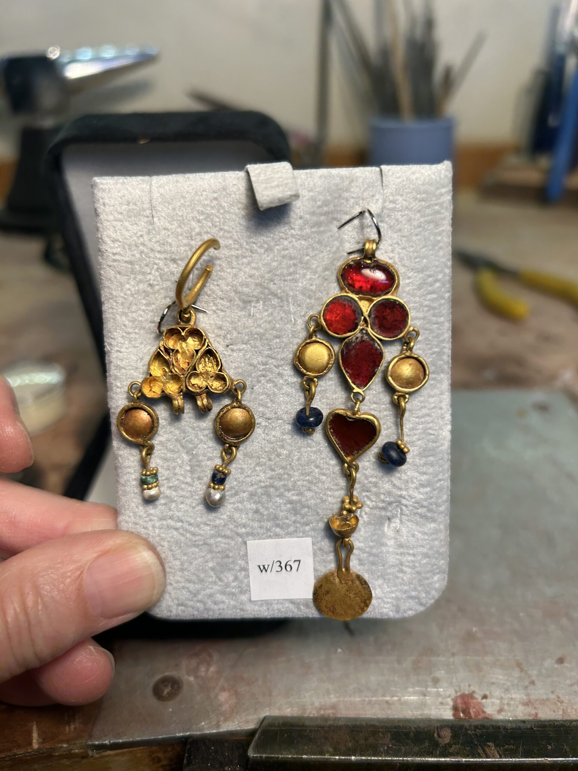 Yesterday we flew into Crete, the island of the Palace of King Minos and his Labyrinth. After dropping our luggage off at the hotel, which looks out over the sea, we visited Anemospilia (“cave of the winds”) on Mt. Juktas, the site of a temple, thought to have been destroyed by the volcanic eruption on Thera in 1620/8 B.C. At the Heraklion Archaeological Museum, we saw the finds that were found on the site and the famous frescoes and objects from the palace at Knossos. And finally, this morning we went to King Minos’s palace, discovered and excavated by Sir Arthur Evans, The “Throne Room” with its griffin fresco is one of the most well-known images in archaeology. What an “amazing” experience to walk through the halls and across the courtyard of this iconic palace. Strangely enough, the site was closed suddenly when gale-force winds of 50 miles per hour caused injuries to visitors. We lunched at a new restaurant called Pasiphae, named after the queen of Knossos and wife of King Minos. Professor Hunt & his team had arranged for a Minoan feast with foods from the ancient island. The food was delicious and fresh, with island ingredients such as dill, barley, coriander, olives, sesame seeds, honey, and mint. The pottery from which we ate and drank had Linear B inscriptions (Linear A and Cretan Hieroglyphs haven’t been deciphered yet!) and was especially made for us.